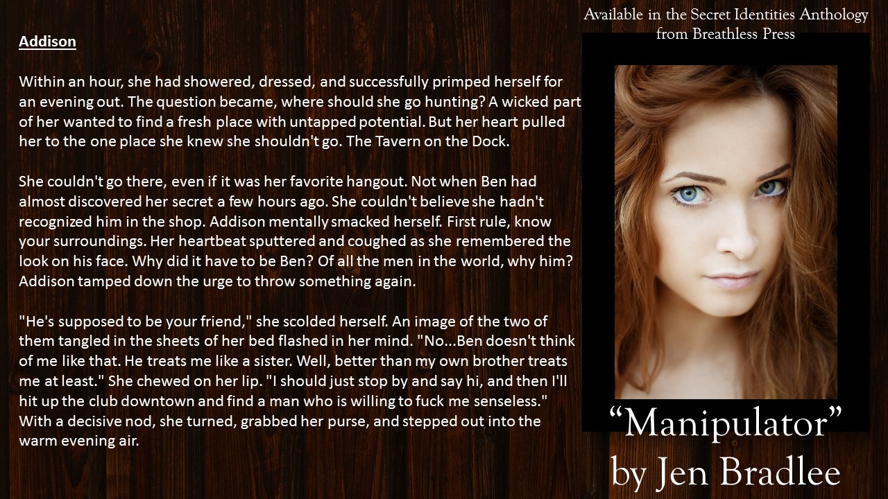 This month I am happy to announce the release of an anthology featuring some amazing talent, as well as two brand new short stories from me! It’s the Secret Identities Anthology from Breathless Press. Super heroes, super villains…this anthology has it ALL!